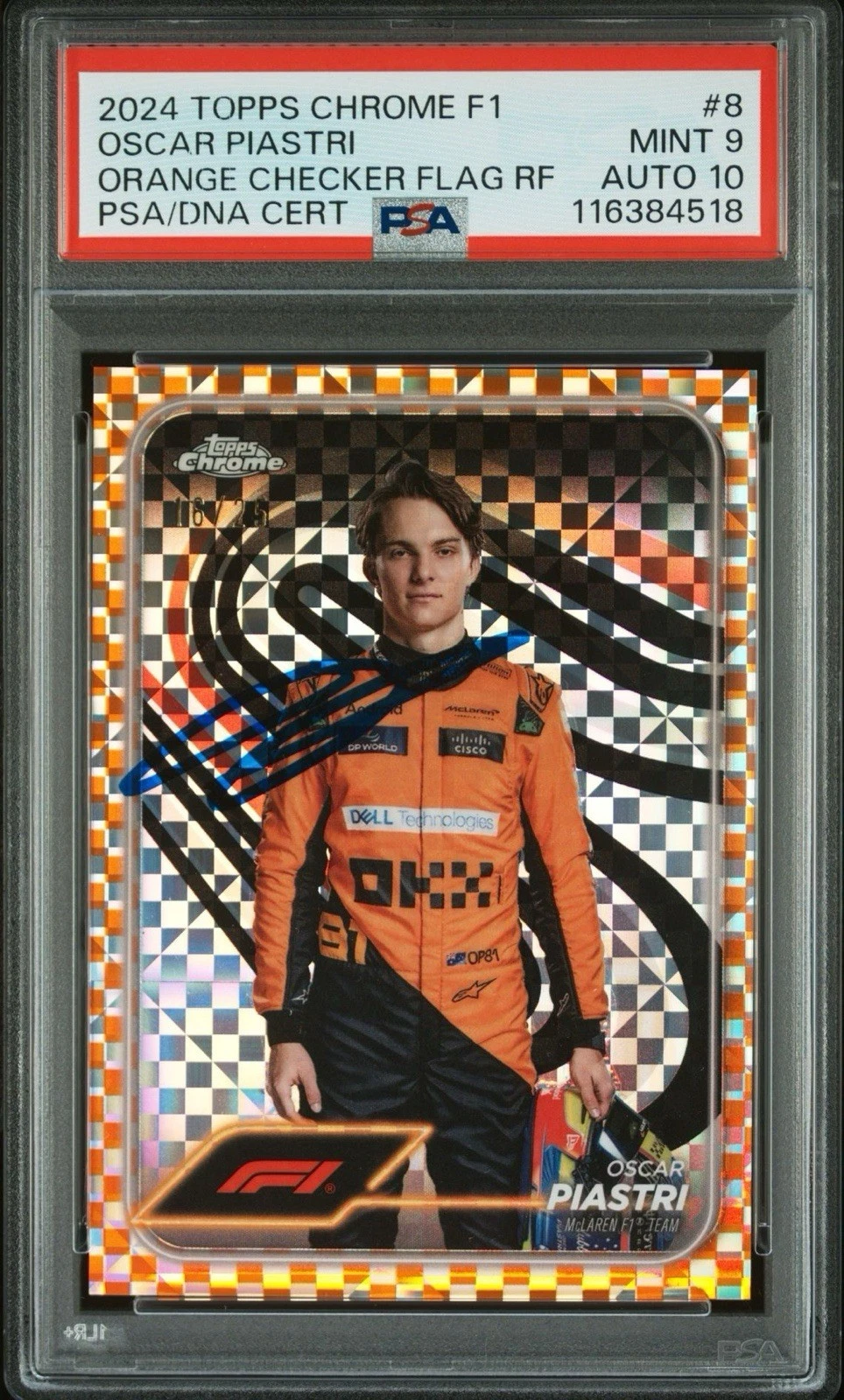 2024 TOPPS CHROME F1 #8 OSCAR PIASTRI ORANGE CHECKER FLAG REF AUTO /25 PSA 9/10 COLLECTIBLE MEMORABILIA